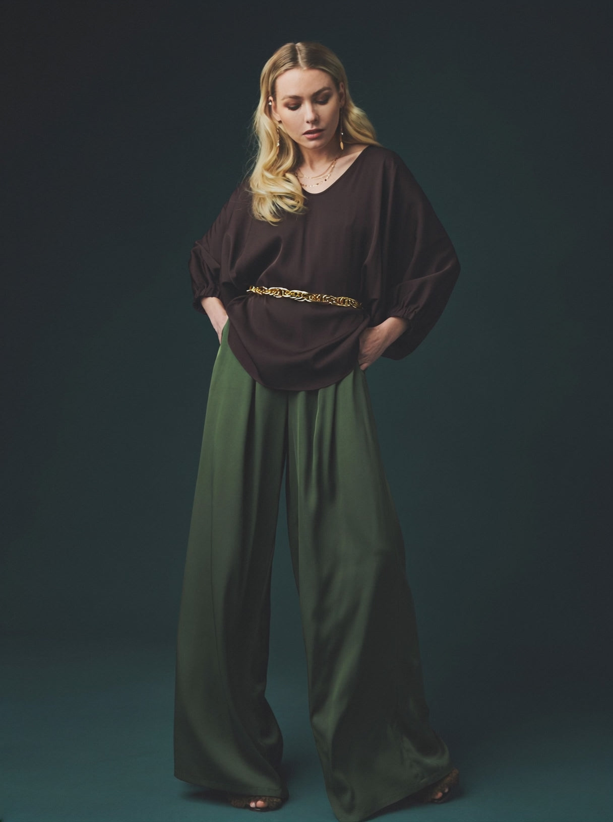 Designed to be effortlessly airy and light, the Austin Top drapes loosely away from the body for a fluid, oversized silhouette. The hi-low hemline and deep V neckline bring ease and modern elegance, while the adjustable sleeves allow you to style it as a voluminous balloon shape or a relaxed ¾ dolman sleeve.